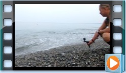 沼津の海岸で海水をペットボトルに入れる