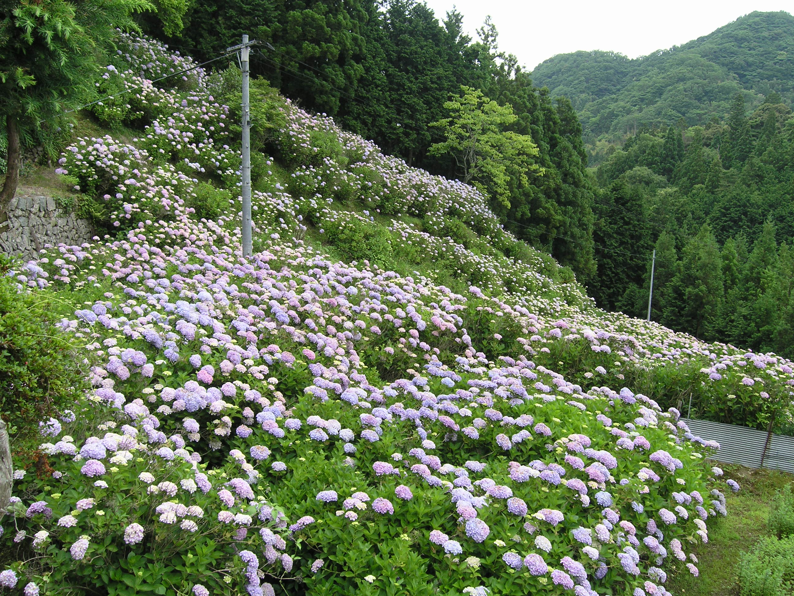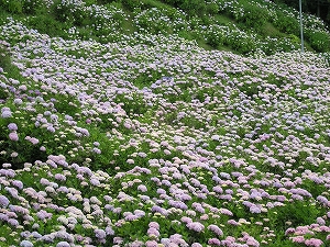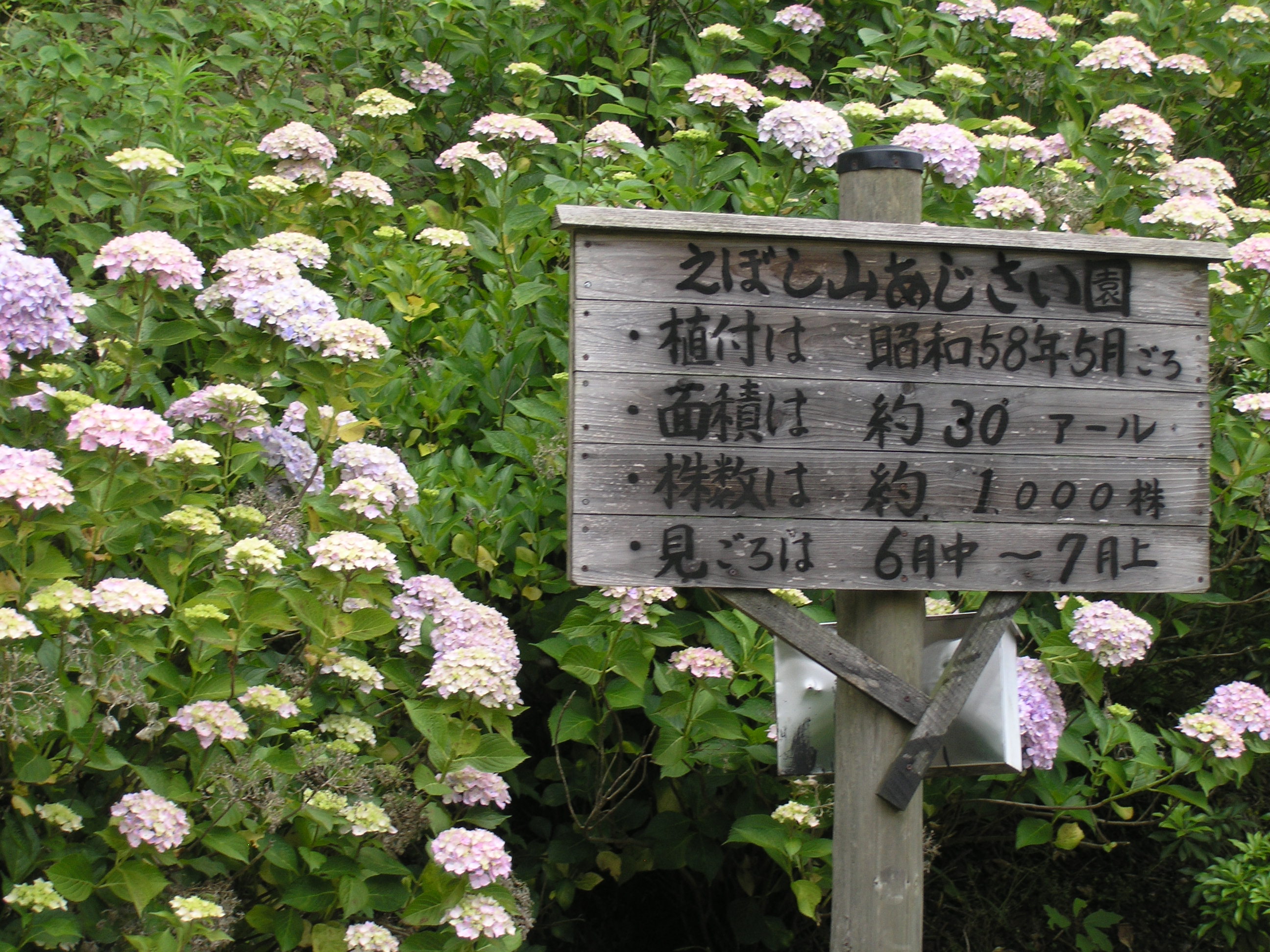 えぼし山あじさい園、毎年のように紫陽花を見に行く、例年なら益田市種町の烏帽子山の入り口に車を置いて、ゆっくり車道を歩いていく、今年は忙しく時間がなく軽自動車で見に行った。車道が狭く、対向車に出会うと車をかわすのが大変である。道幅も狭いので、大きな車や運転に自信のない人は運動に歩いたほうがいいだろう。