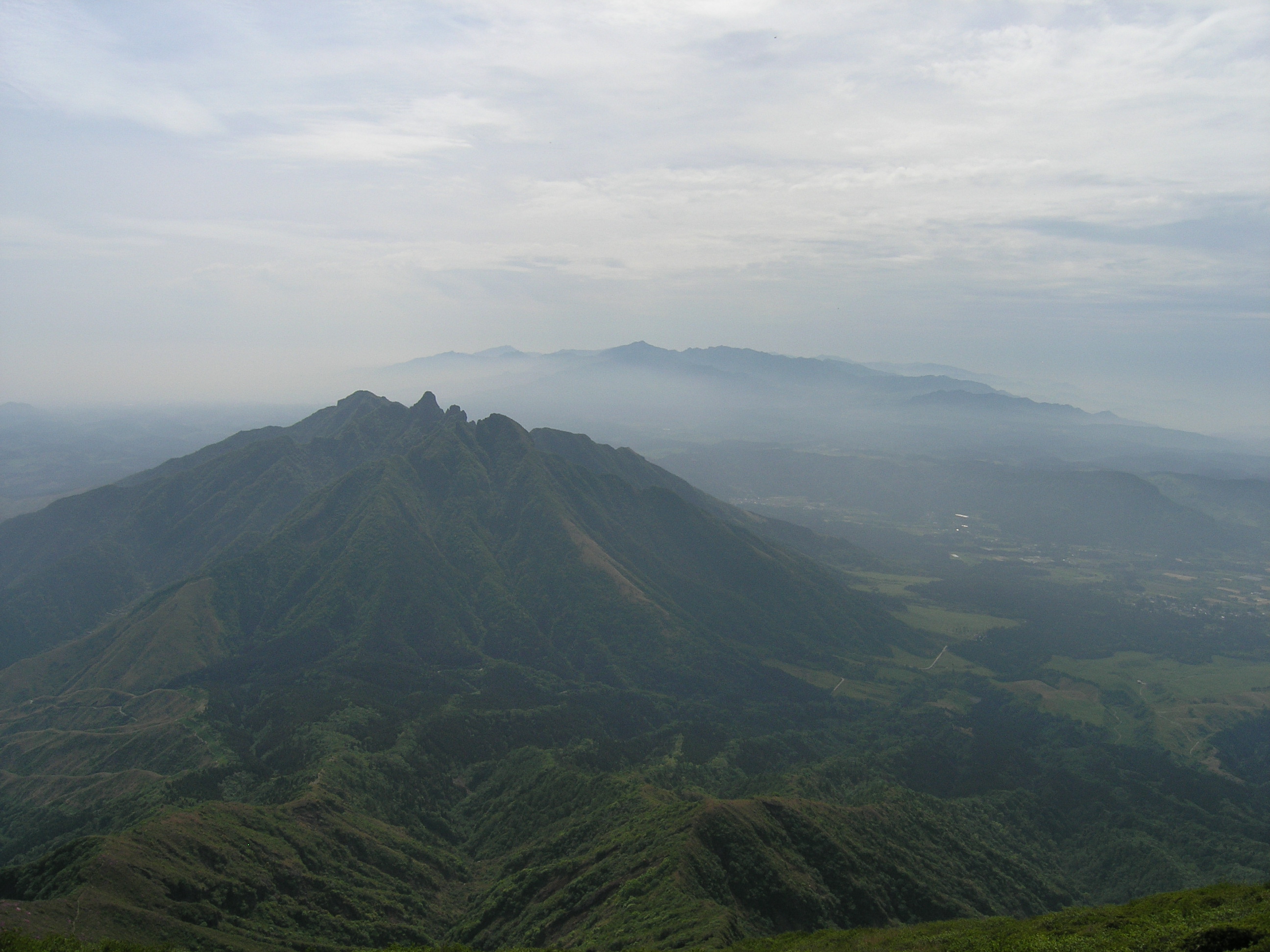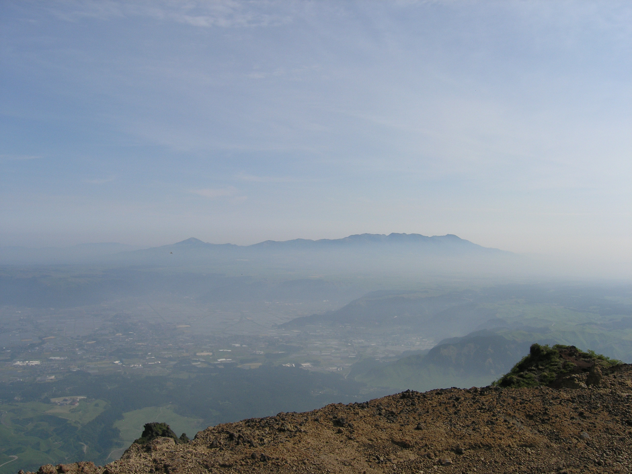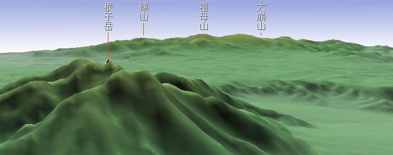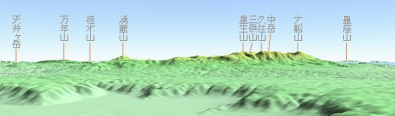 | カシミールで作成した展望図で下の写真と比較してください。九重連山 根子岳、祖母山 | |
