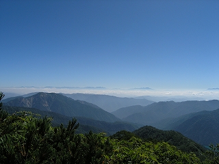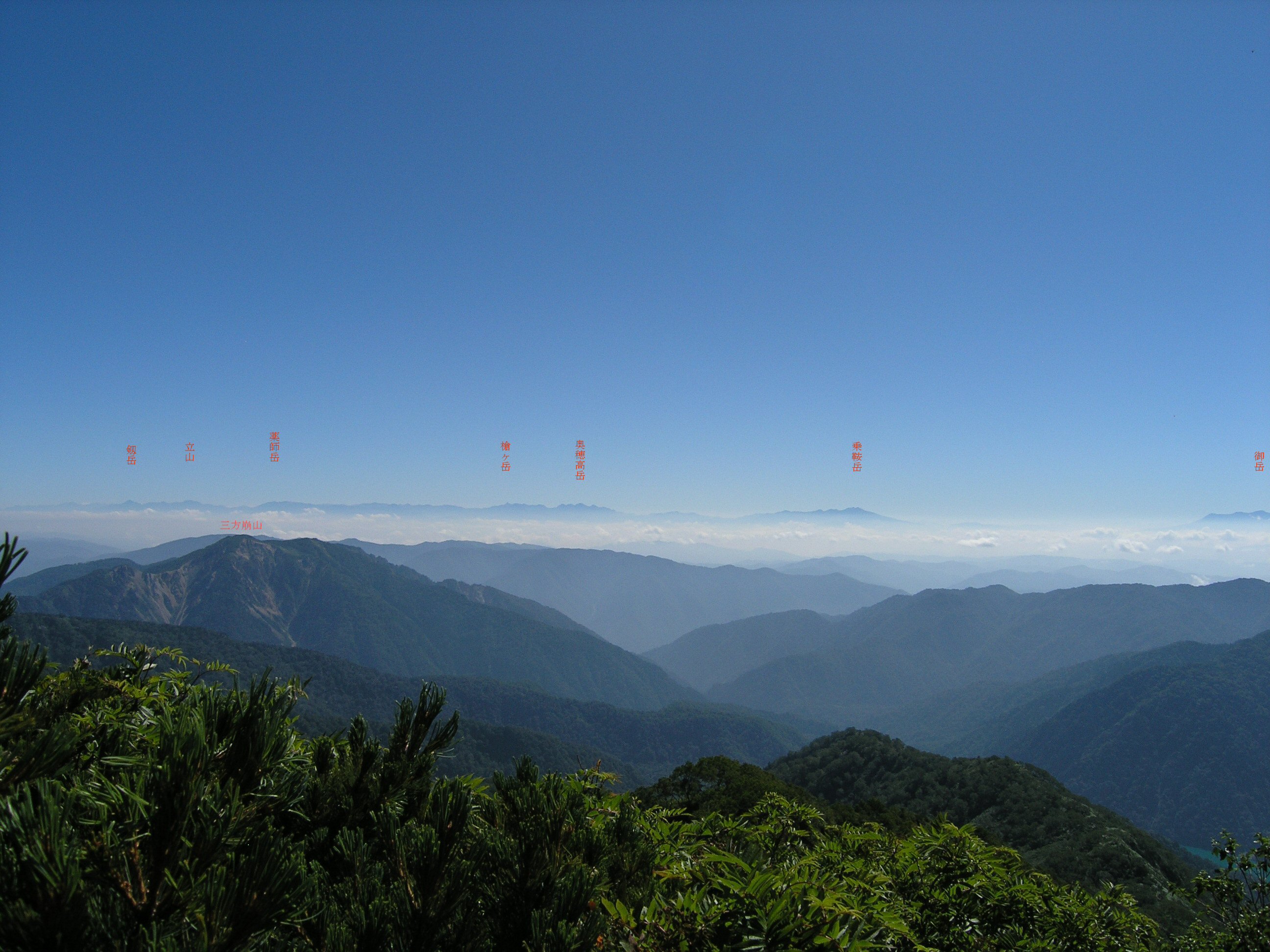 9:25 遠くに北アルプスがみえる。クリックすると大きな写真。山の名前を記入しました。 |