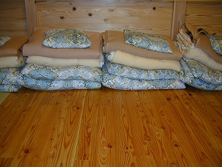 | 2階の大部屋で寝る。この布団の幅が一人分 |