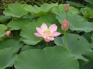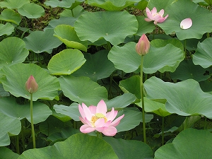 益田市久城町にある国指定史跡・スクモ塚古墳の池で、古代ハスが咲いていました。 斐川町の荒神谷史跡公園から株分けされたものを、地元の久城伝承文化顕彰会が01年に植えたそうです。