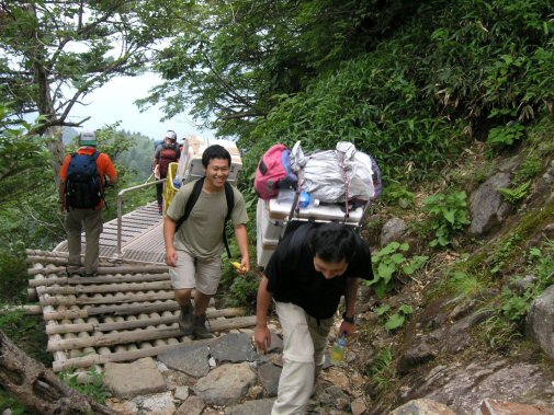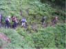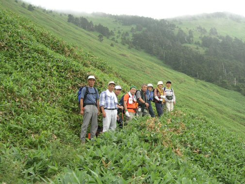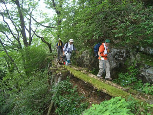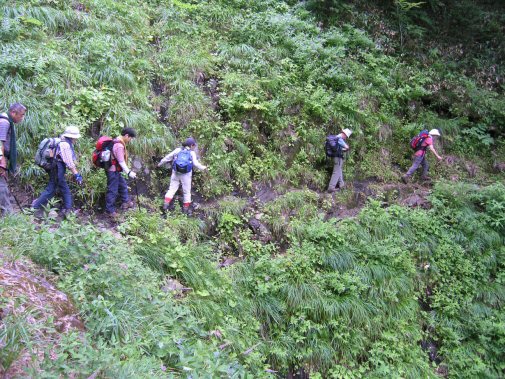 滑りそうな道を注意しながら進む。この後、何箇所かすべりそうな場所があった。、万が一を考え、持参したザイル補助的に使いながら進む。 |