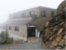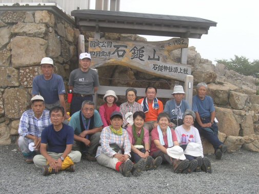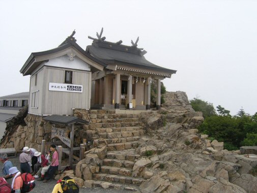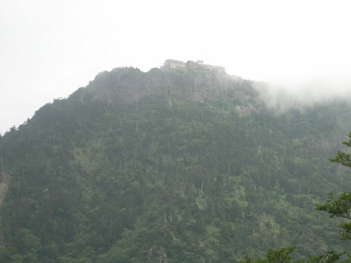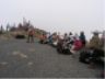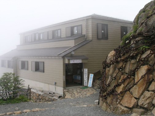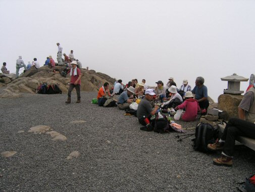 山頂で昼食をとる。ガスで何も見えない。山小屋で冷えた350mlのカンビールを550円でうっている。 |