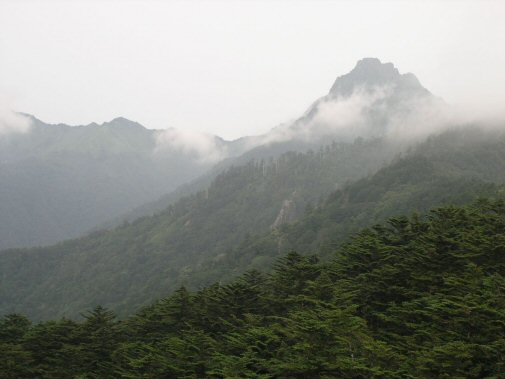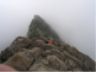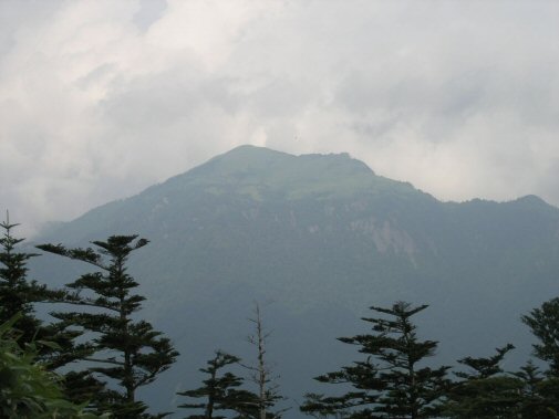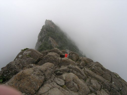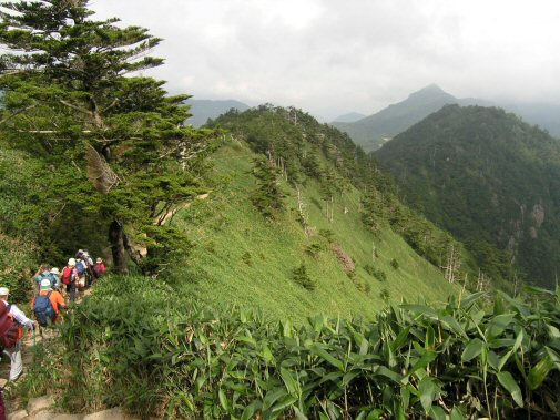 二ノ森のルートとの合流点。振りむいての写真。手前が石鎚山頂、右上が二ノ森、左下が面河方面 |