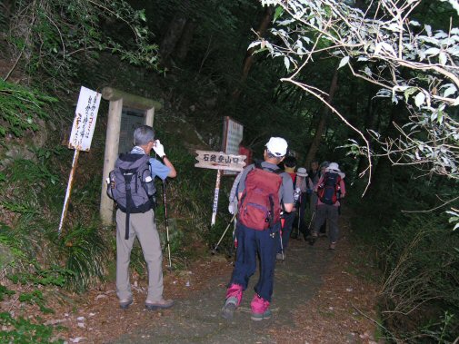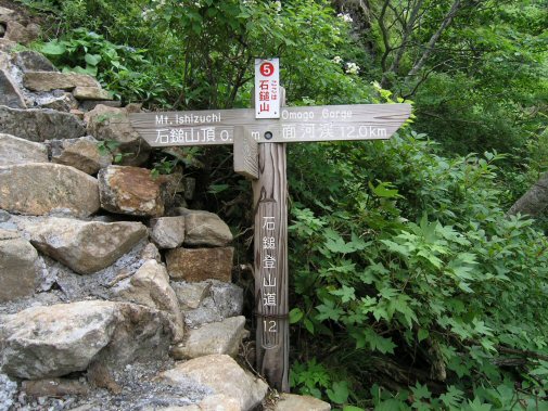面河渓を右下に見ながら歩く。暫くすると「石鎚登山口」の看板がある。