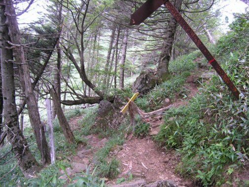 面河ルートと土小屋、成就方面からの道との合流点に立つ標識。二ノ森、面河方面の道は通る人が少なく標識がないと判り難い。 |