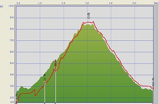 | GPSで記録したグラフ。横軸=距離、マウスを乗せると横軸=時刻 | GPSで記録したルート。クリックすると拡大。 大きな地図へリンク |