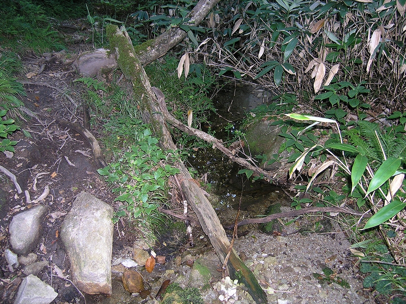 左の図の青色の旗のマークの場所が水場 山頂手前約10分の場所 水量は少ない。登山道にクロスする形で鞍部に水が溜まっている。 常に利用出来るか疑問である。 水場の写真 |