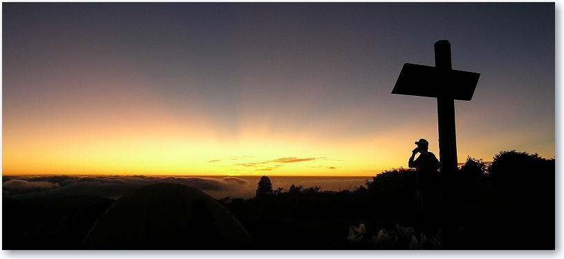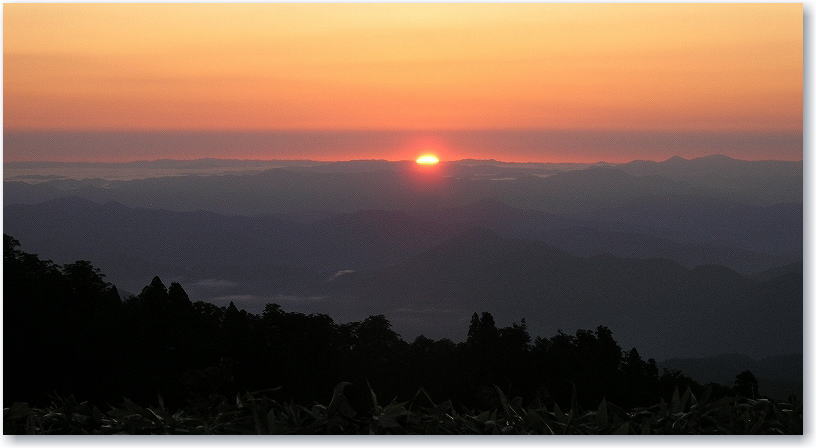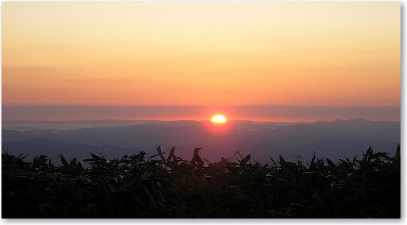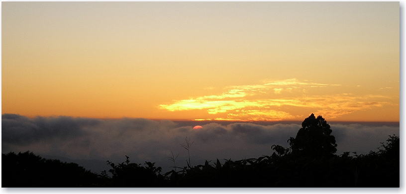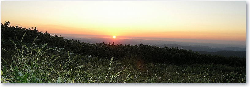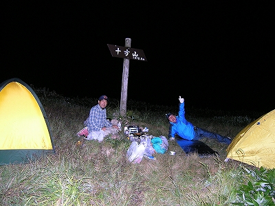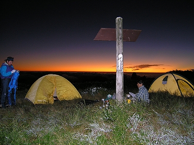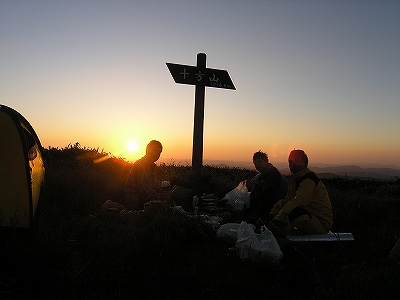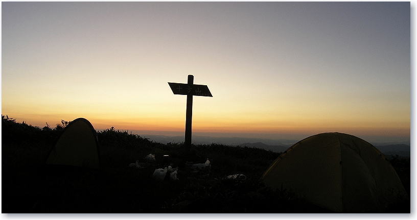 | 9月9日14:15内黒峠出発。(午前中仕事) 17:11十方山山頂到着 テントやビール、食料を各自20kg前後のリュックを下ろしテントを設営し晩餐の準備をする。 360度の展望を楽しみながら焼肉とアルコールを楽しむ。 快晴の空の西方を暁の夕日が染めていく。 西中国山地を埋める雲海に太陽がゆっくりと落ちていく。 日の入りと共にに気温が下がり露点温度となりテントにを湿らす。 防寒具を身にまとい、アルコールを胃にそそぐ。 夕闇と共に満点の星空が現れるが疲れとともに各自テントに入る。 夜中に目を覚ますと月明かりでテントが明るい。夜中に風が出てきて、テントをフライシートが叩く。荷物の軽量化の為シュラフの代わりにシュラフカバーにしたら寒い。心地よい眠り時に「そろそろご来光の時間だ」のこえに起こされ外に出ると東の空が明るくなっている。 ご来光をカメラに納め朝食。 テントを撤収し、リュックに荷物を納める。昨夜の飲食の分だけ荷が軽い。 7:20出発 10:00内黒峠到着。 メンバーの一人は午後の仕事に復帰。 |