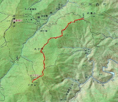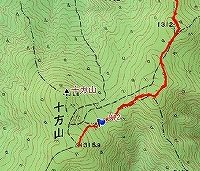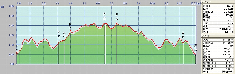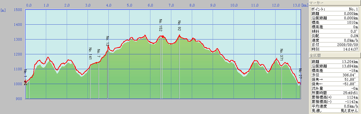 | GPSで記録した内黒峠→十方山山頂→内黒峠のグラフ 全行程13.2K 1212×384にリンク | ||