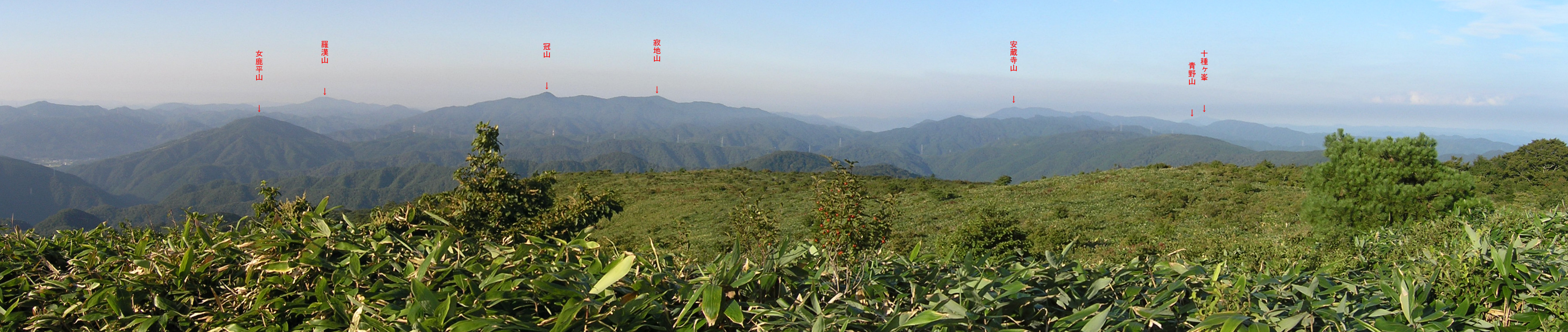 | 7:14 山頂からのパノラマ 3587×760にリンク(山名を記載) | ||