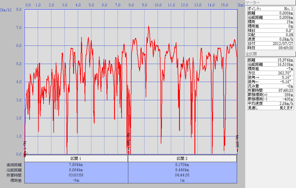 楽しい一日でした。朝、日焼け止めを塗ったのに、お昼に顔を洗ったので顔が真っ黒に焼けてしまいました。日焼け止めは持ち歩かないといけませんね!!![]() ルートラボ 漕ぎ方が悪いのか速度が出ていません。 GPSで記録した速度 |