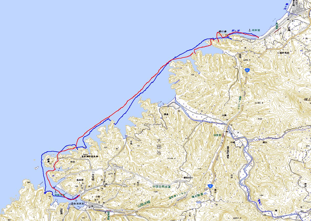 | GPSの記録。青の線が行き、赤の線が帰り。(拡大図有) |