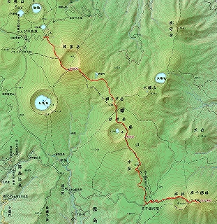 えびの高原→韓国岳→獅子戸岳→新燃岳→中岳→高千穂河原→高千穂峰→高千穂河原