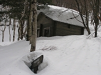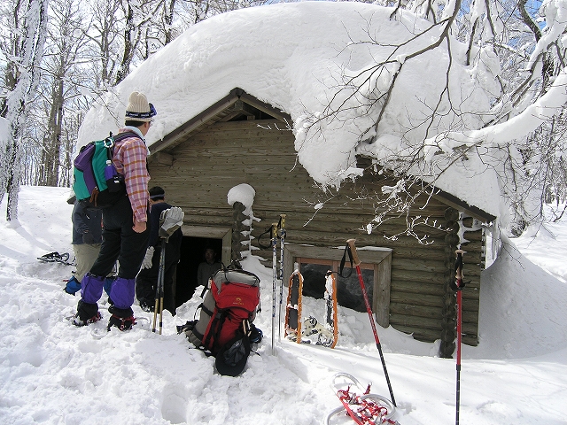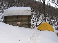 頂上手前の避難小屋。雪を掘り小屋の中を確認する。12:30 |