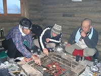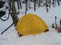 | 下山後の渓谷コースの山小屋 | 宴会後テント泊に挑戦。思ったより寒くなかったが、夜中にテントの周辺に獣が来たと思ったら風のいたずらだった | 写真をクリックすると宴会のページ |