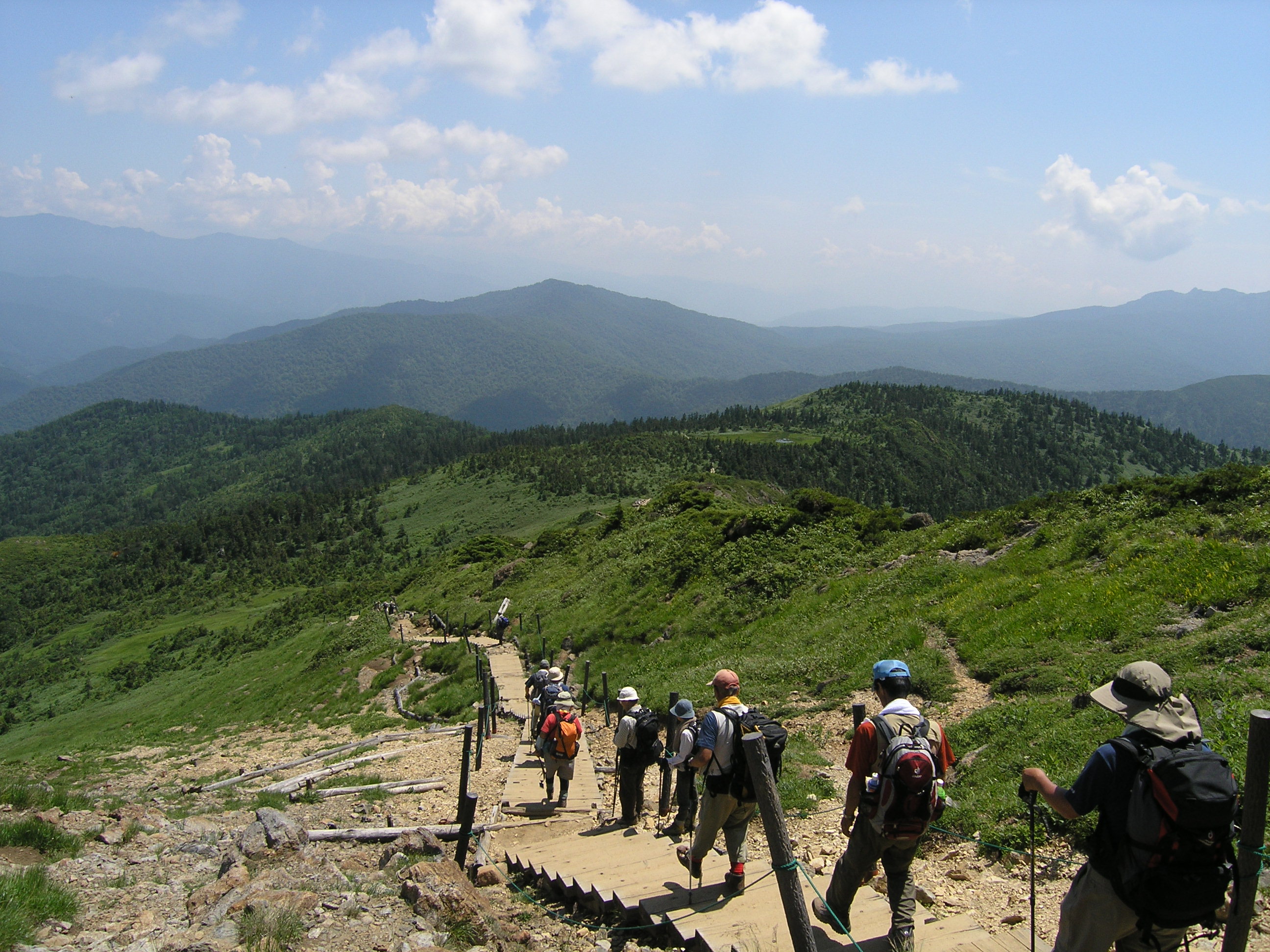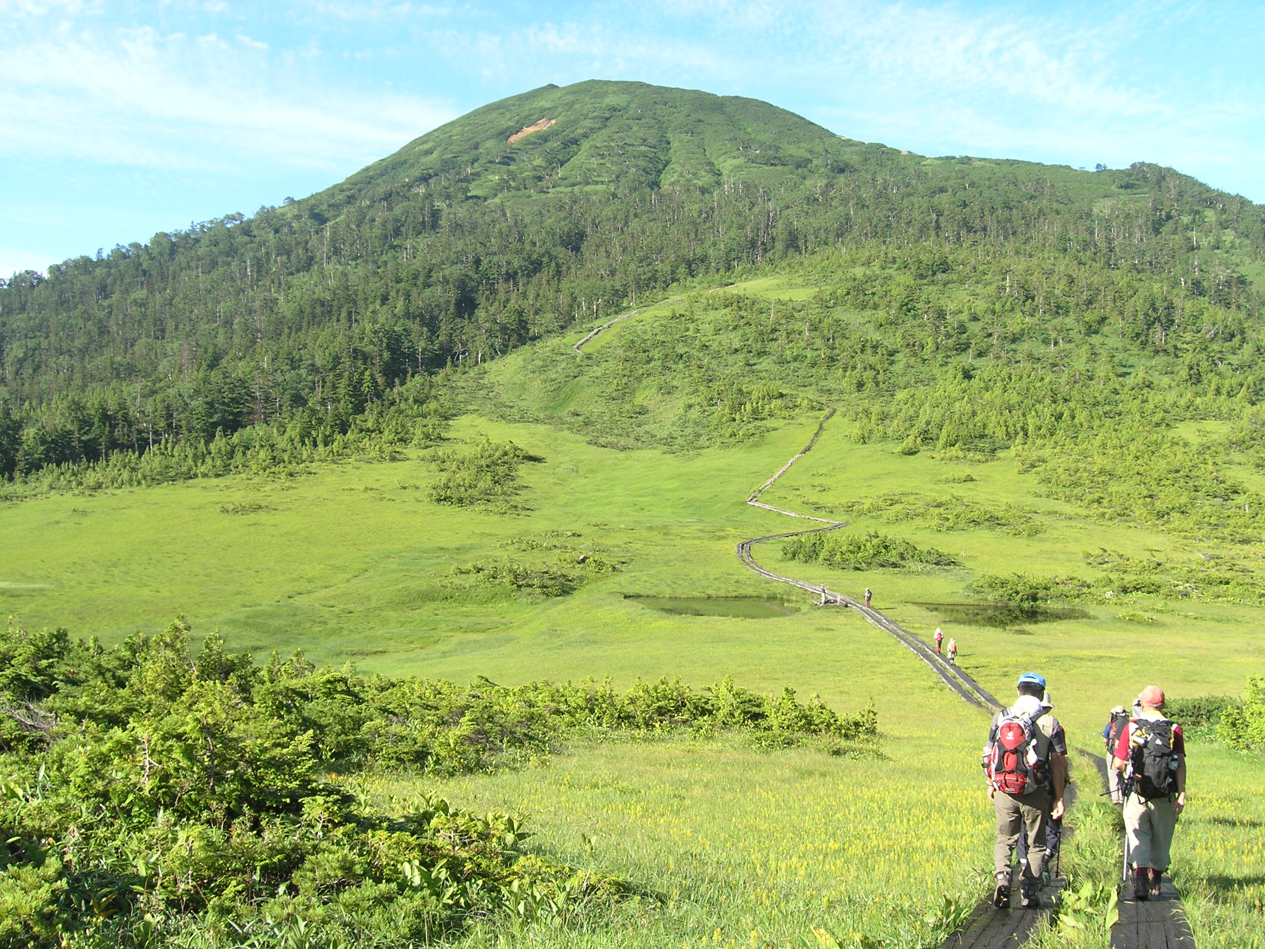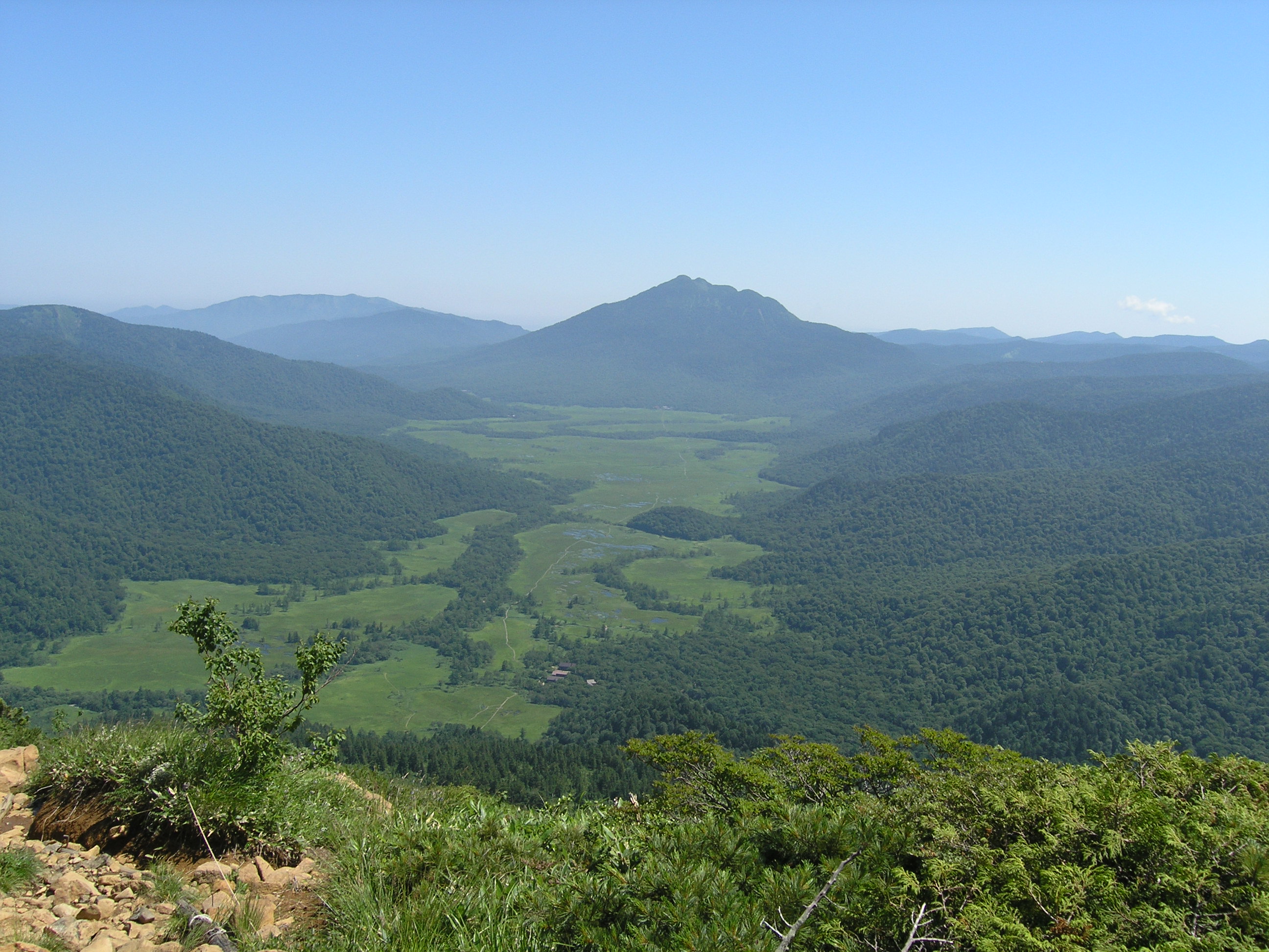 | 神名火山の会の尾瀬山行に参加させて頂きました。総勢19名を2班に分けて行動、天候に恵まれ行動中、雨具を使用することもありませんでした。 7日5:10尾瀬御池→6:15広沢田代→7:20熊沢田代→9:15俎ー→10:00柴安ー(昼食)10:55→尾瀬小屋13:55 8日4:55尾瀬小屋→5:25竜宮十字路→6:00尾瀬ヶ原三又→6:45山の鼻小屋(朝食)7:20→9:16(1866m)熱中症患者9:55→11:20至仏山(昼食)11:48→12:30小至仏山→13:00オヤマ沢田代→14:15鳩待峠 |