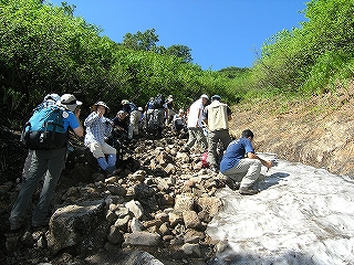 | 8:36 雪渓の雪を確保しビールを冷やす | 9:20 俎ーより尾瀬沼を見下ろす |