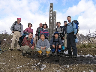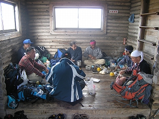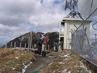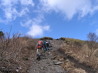 頂上直下の雪渓が滑りやすく、キックでステップを確保しながら登りました。 |