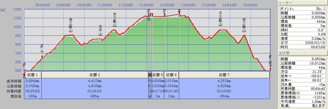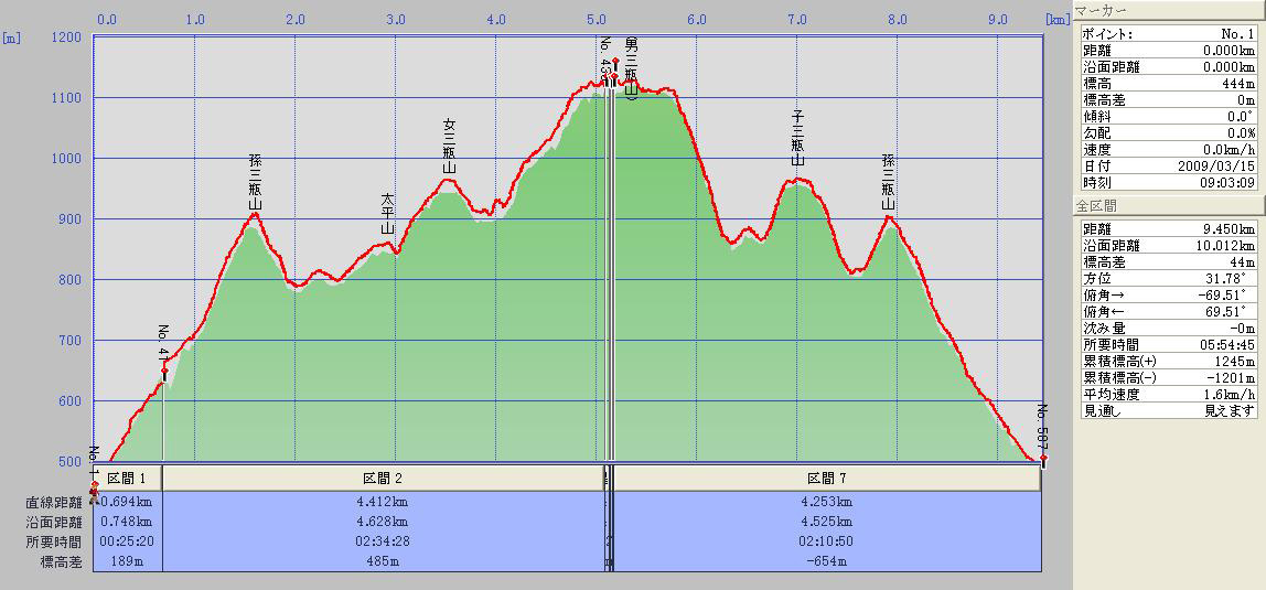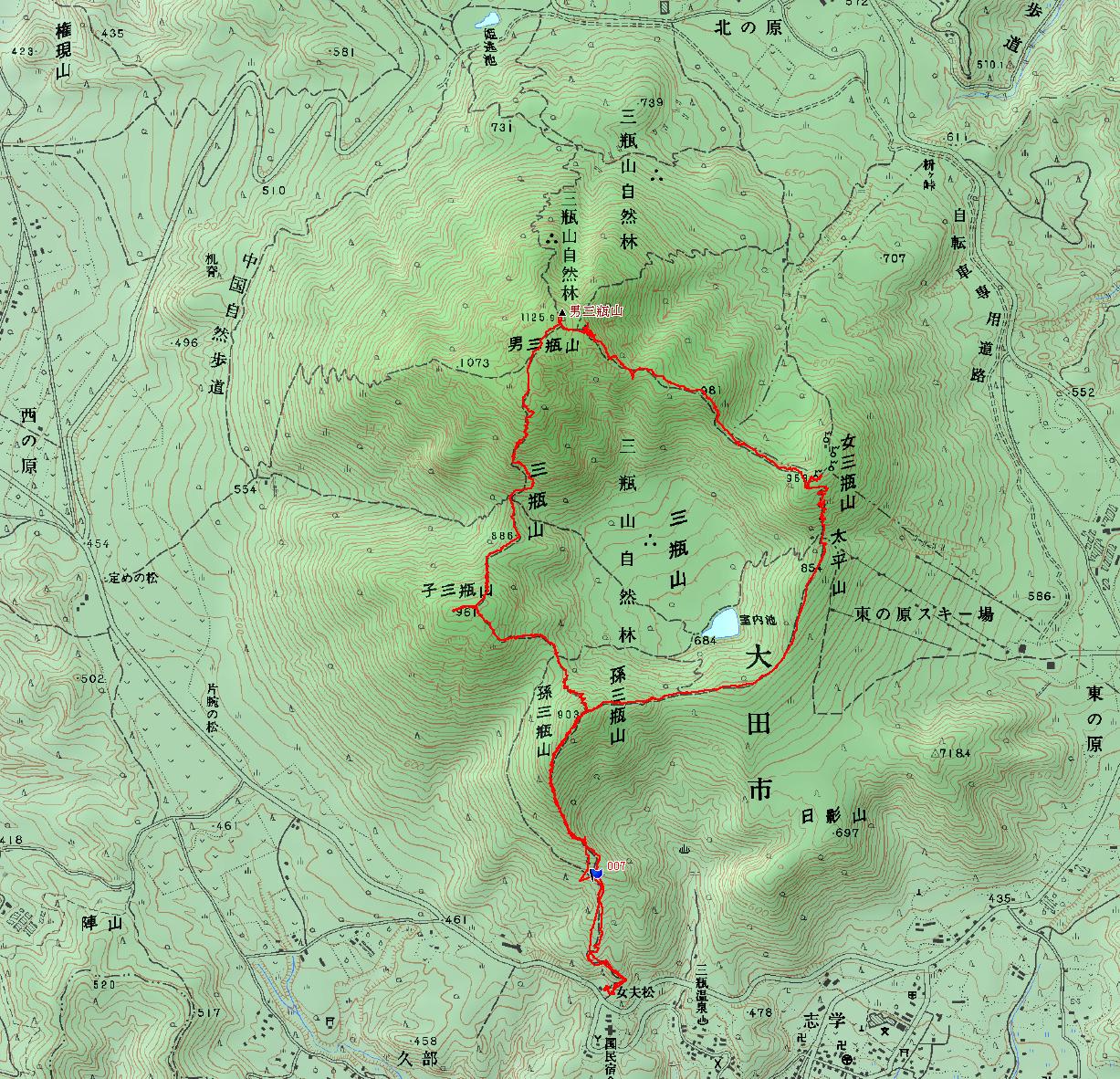9:10登山口→10:05孫三瓶山903m→10:45太平山854m→10:10女三瓶山958m→12:00男三瓶山(山小屋)〜12:45→12:50男三瓶山山頂1125.9m→13:25鞍部→13:50子三瓶山961m→14:12鞍部→14:20三瓶山903m→14:55登山口 |