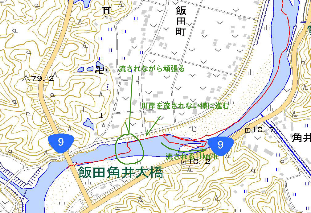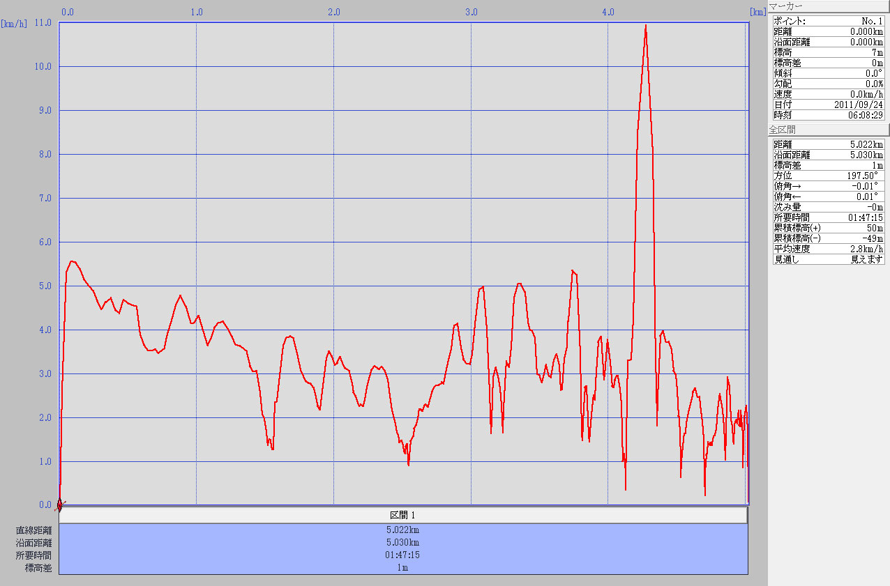 ![]() カヤック区間のGPSで記録した速度 後半の早い瀬で流されました。速度が11Kmぐらい出ています。 |