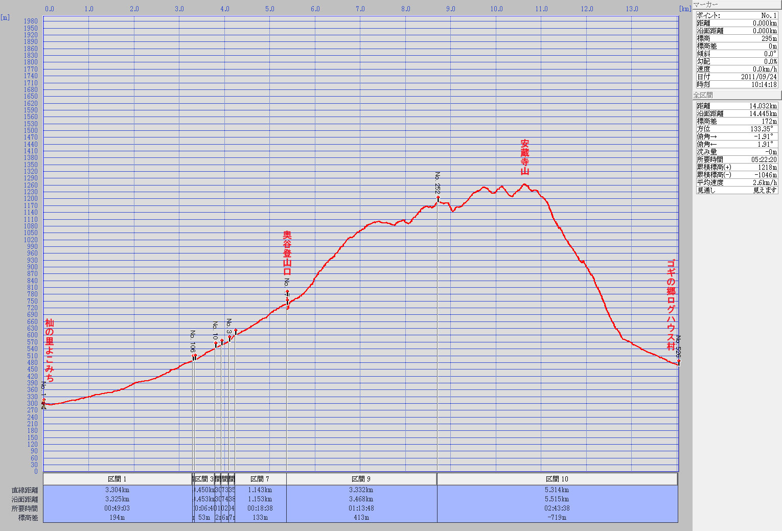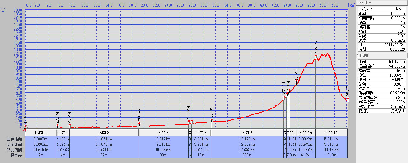 「シングルの部」結果 「チームの部」結果 6:08スタート→8:08バイクスタート→8:50道の駅→9:33左鐙小学校→10:13杣の里→11:38登山口→13]36安蔵寺山山頂→15:36ゴギの里 私のGPSで実測したデータ。スタートからゴールの安蔵寺山山頂+下山で約55Km。 ![]() |