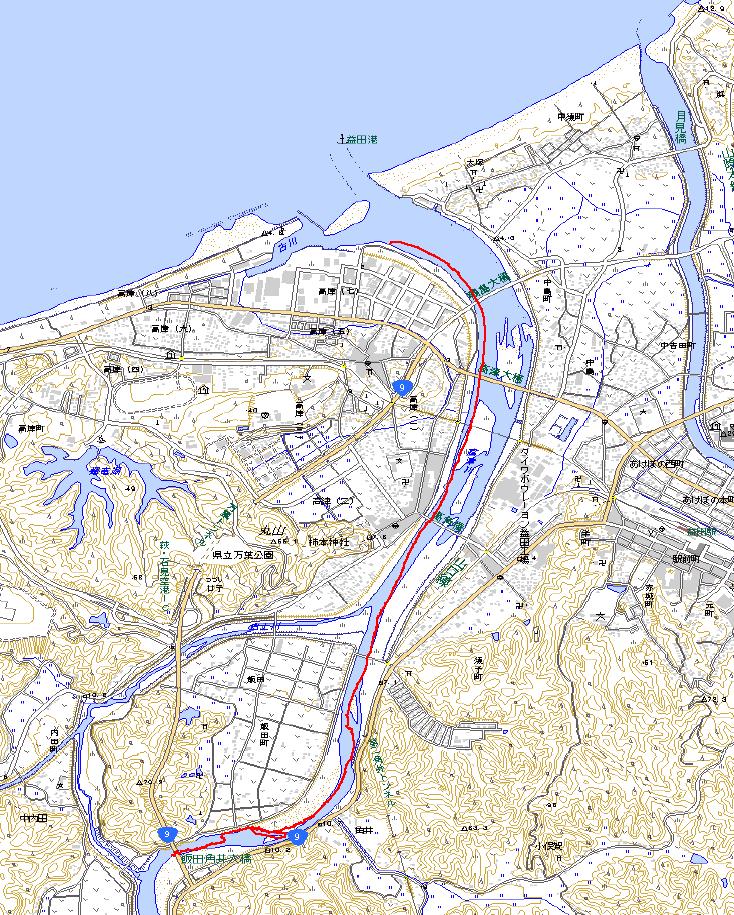 ![]() 当日は波が高く、川の水量もおおく流れが速いため海の高津川河口から益田川河口の往復を省略しました。 ヘルニアで体力が回復していないので完走を目標にマイペースで挑戦。 |