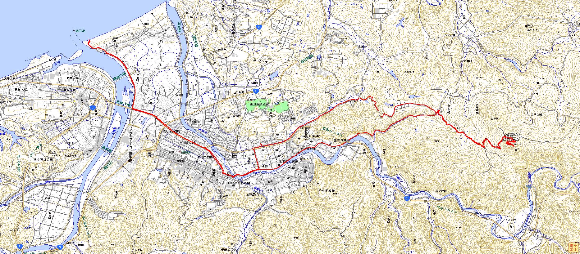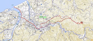 GPSで記録したるーと。往路は三宅町から染羽を通り、復路は東町(地図では上の線)を通り合同庁舎の所から益田川るーと(往路)で帰りました。