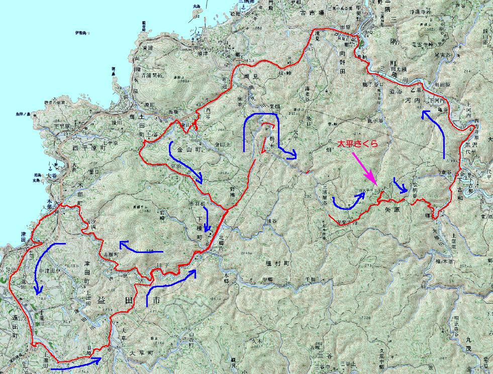 9:05自宅出発→9:40下種鎌手分岐→10:15大平さくら 10:25→11:00三隅国道9号→11:23国道より金山へ→12:35自宅