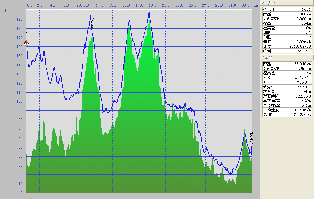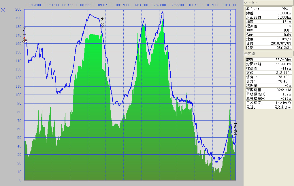 | GPSで記録したグラフ横軸=距離 拡大図有り | GPSで記録したグラフ 横軸=時刻 拡大図有り |
