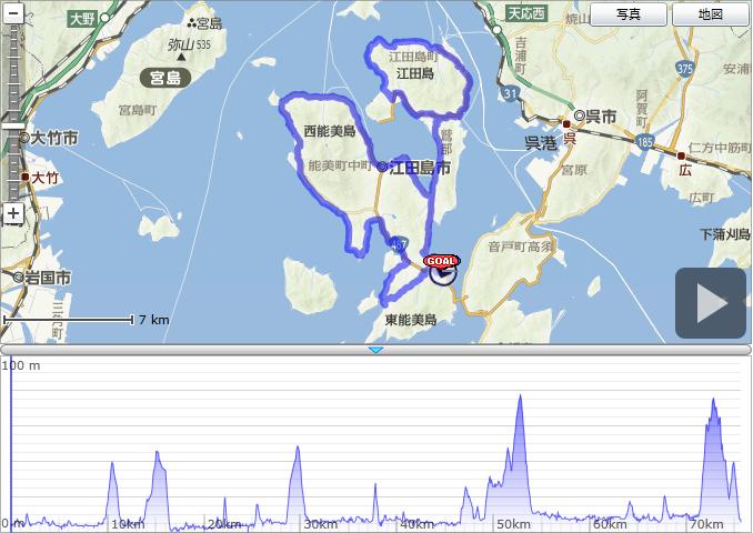 | 益田サイクリングサークル(mcc)で呉へ一泊ライドを行うと言う。ヘルニアリハビリ中なので、メンバーの速度に付いて行く自信がない。広島の親戚に前泊して一度走ってみたかった江田島へ。 8:08大柿スタート、江田島のサイクリングマップを参考に75km走り13:40元の場所へ。 メンバーとの合流まで時間があるので以前から登って見たかった古鷹山登山。登山口まで車で移動して服を着替えて古鷹山へ 14:10 登山口 →15:00 古鷹山(394m) 15:10 →16:00登山口 その呉の宿泊宿へ mccメンバーと合流し呉のmccメンバーと食べて飲んで楽しい一夜を過ごし翌日は車で戸河内まで移動しそれから皆は自転車で益田へ。私はほとんどサポート |
