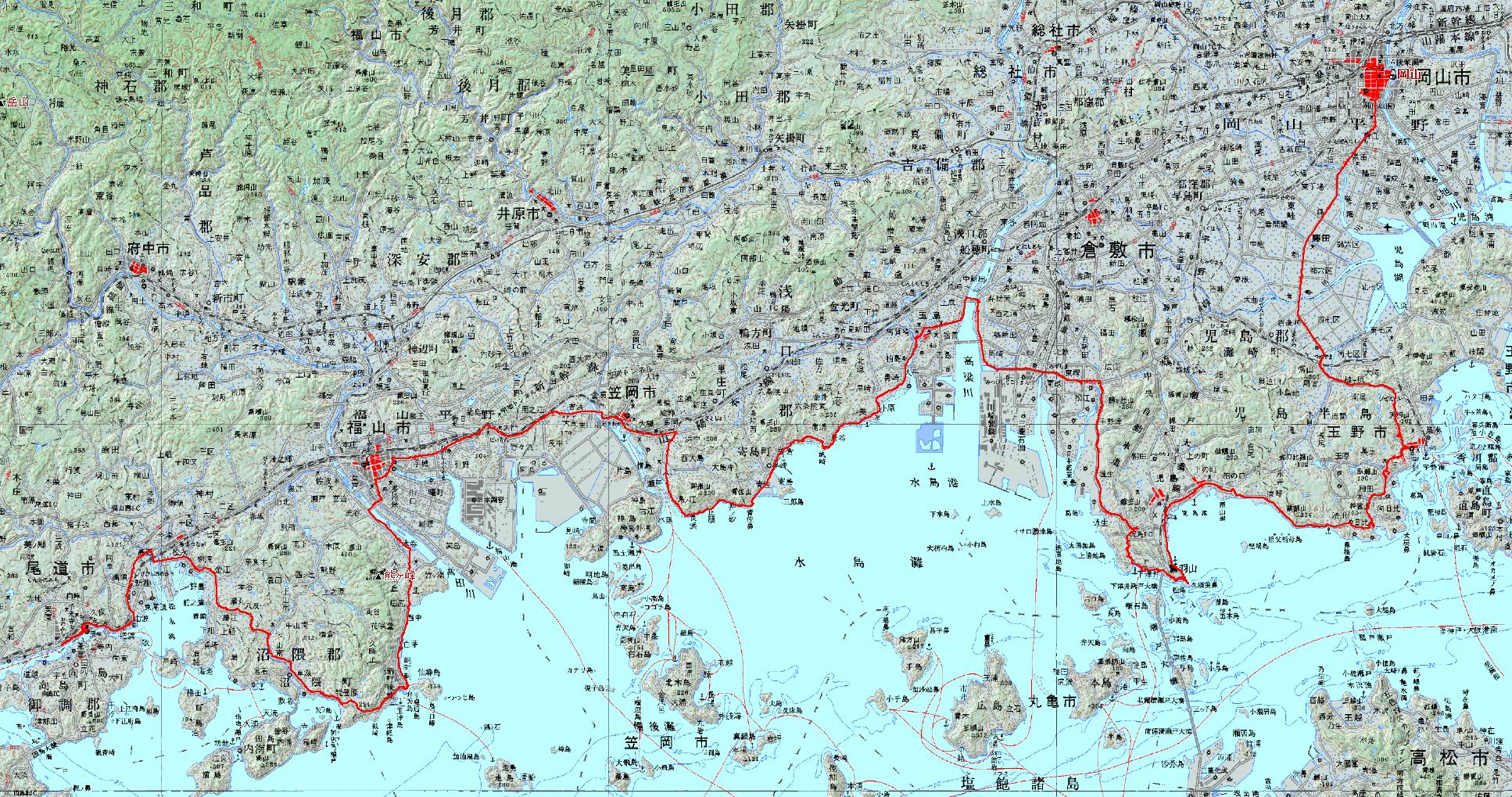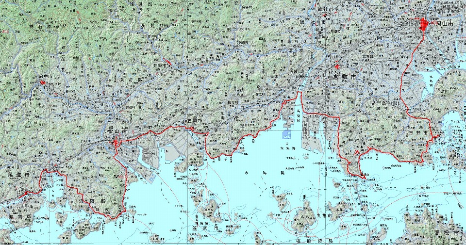 7:35岡山駅出発。地図とGPSでルートを確認しながら走る。天気に恵まれたが帰りの高速のSAで赤く日焼けした顔をみて日焼け止めを塗らなかったのを後悔する。