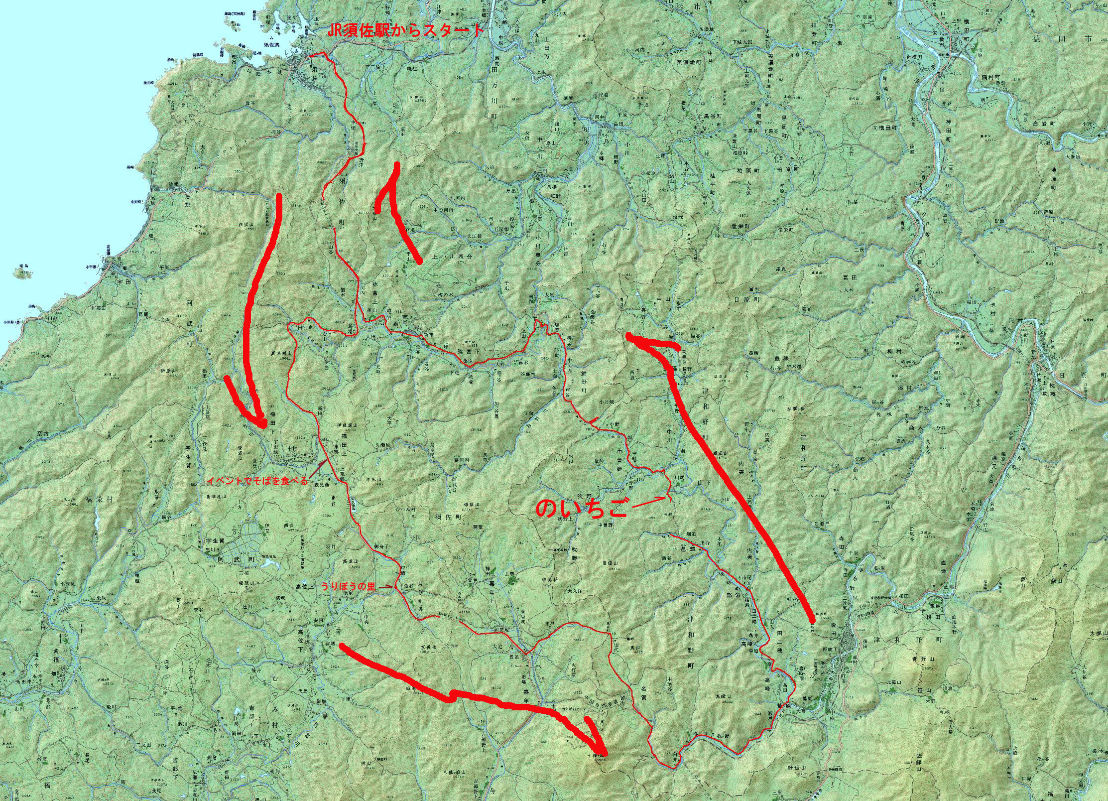 9:24 JR須佐駅 9:50 須佐大橋 10:59 イベントにて山菜そば 11:25 うりぼうの里 12:30 津和野町鷲原 13:45 津和野町木部の県境 14:50 JR須佐駅 ![]() |