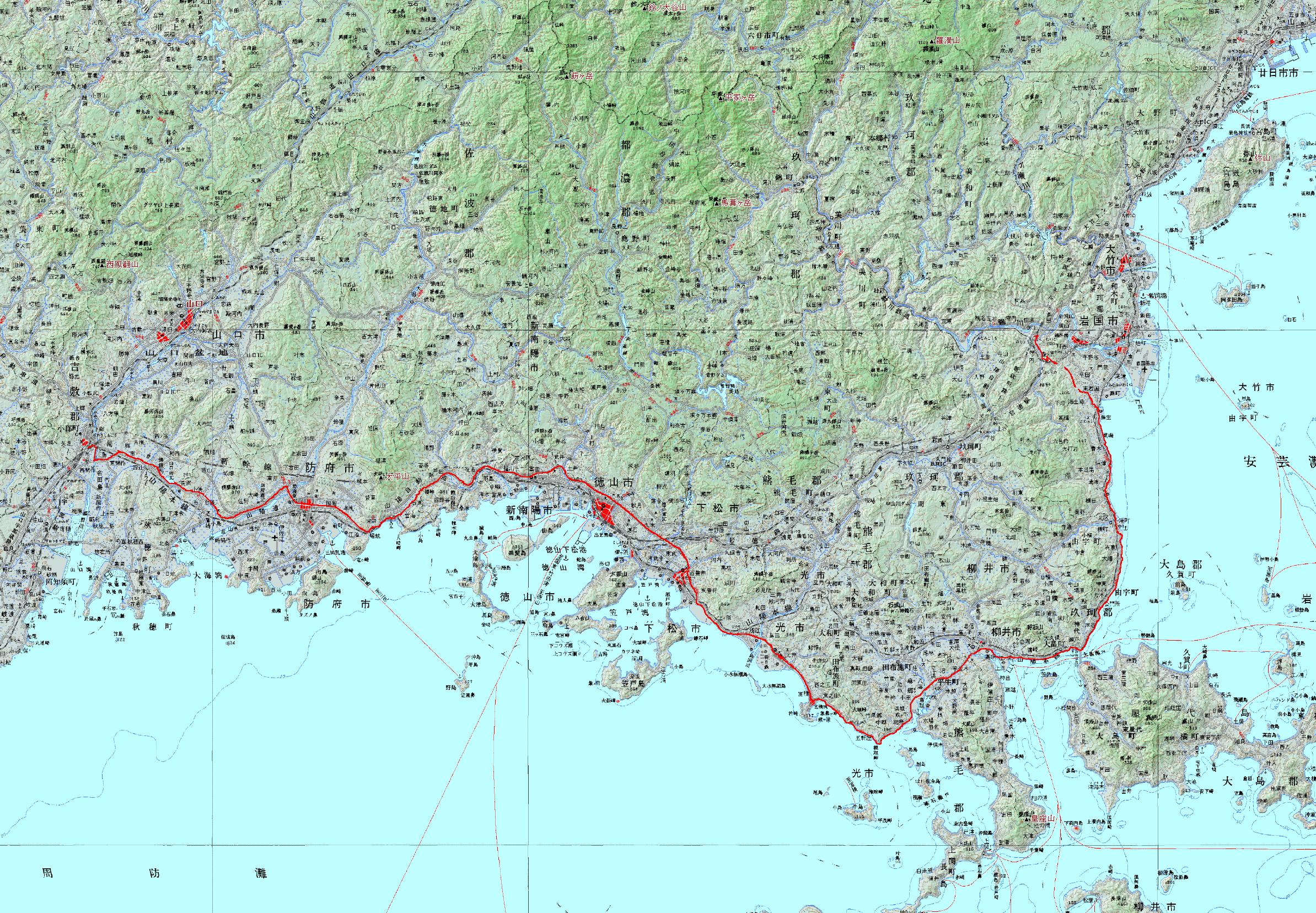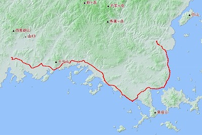 | 朝3:30起床。車を走らせ新岩国駅へ、一日350の駐車場へ車を止める。6:16発6:47新山口着。駅前のコンビニで朝食を済ませ出発。交通量の多い国道は怖いので一般道を走るがアップダウンがきつい。天気が良く暑いので水分補給を十分にする。 | |