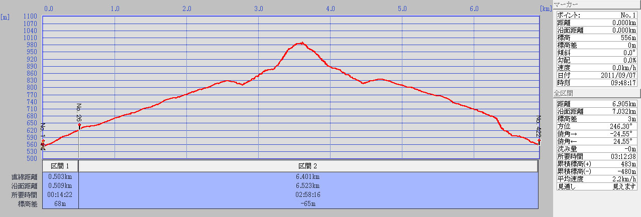 | GPSで記録したルート(拡大図有) | GPSの記録 横軸=距離(拡大図有) |