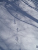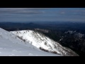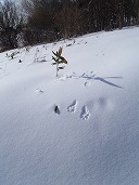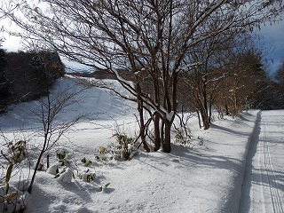 | 11:34 林道は雪がスノーモービル用に踏んである。 左は山頂よりの滑降ルート |